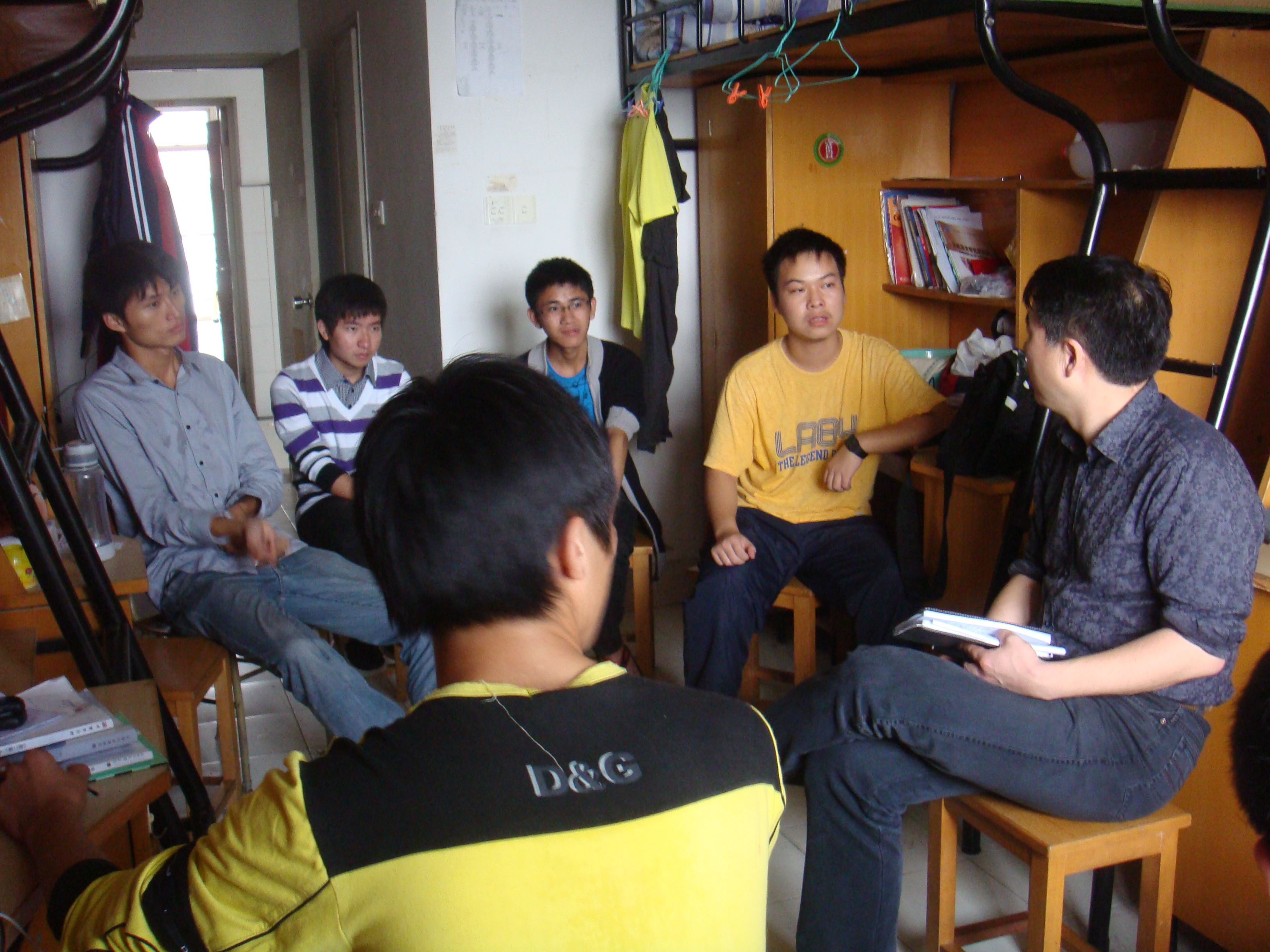 46名教师党员和92名学生党员联系人一起深入到2011级96个寝室380余名学生中去,与学生面对面交流座谈。
