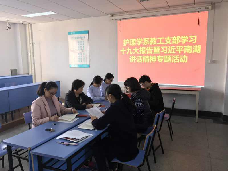 11月23日下午,在365bet 党委的组织下,365bet 各党支部以丰富的形式专题学习十九大会议精神。机关党支部通过学习红色经典书籍、原原本本读报告、人人读报告的形式学习十九大会议精神;基础医学部教师党支部组织学习十九大报告,并对精准结对困难学生的支部活动进行计划和安排;药学系教师党支部集中收看习近平南湖讲话视频,学习十九大报告,注重政治理论学习与业务学习相结合,尔后开展了国家自然基金撰写学习;护理学系教工党支部在医学实验中心结合即将到来的护理学科竞赛,认真学习十九大报告和新党章,以十九大会议精神引领学科竞赛工作开展;医学实验中心教师党支部通过学习十九大会议精神提高团队凝聚力,结合临床医学专业认证回访工作,对近期实验建设工作进行安排和总结。