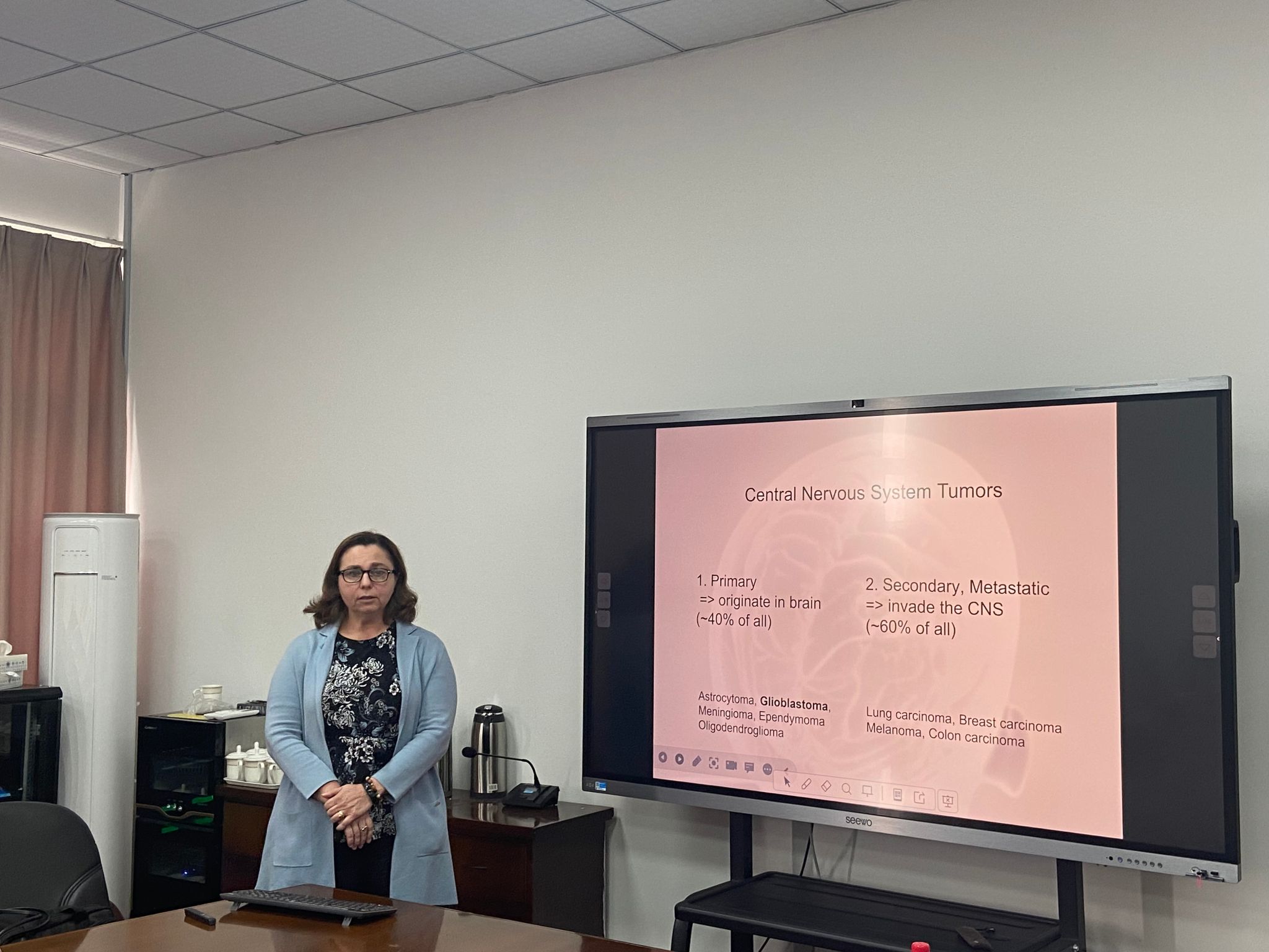 讲坛”第二讲环节在仁心楼426会议室进行,会议由Alexey Semyanov院士主持。Vladimir Parpura院士作题为《Vesicular Glutamate Release from Astrocytesat the Interface of Signaling and Metabolism》讲座,内容主要涉及星形胶质细胞释放神经递质谷氨酸及其囊泡融合的时空特性,以及葡萄糖和乳酸盐对星形胶质细胞释放谷氨酸的调节作用。Vedrana Montana教授作题为《Malignant Glioma – from Bench to Bedside》的讲座,主要介绍缓激肽2受体(B2R)可以作为胶质母细胞瘤的一个治疗靶点,以及B2R阻断剂艾替班特(Icatibant)可用于抑制恶性胶质瘤侵袭的辅助疗法。神经科学研究中心团队成员Maxim、Alisa和熊佳丽博士分别进行了科研工作汇报。