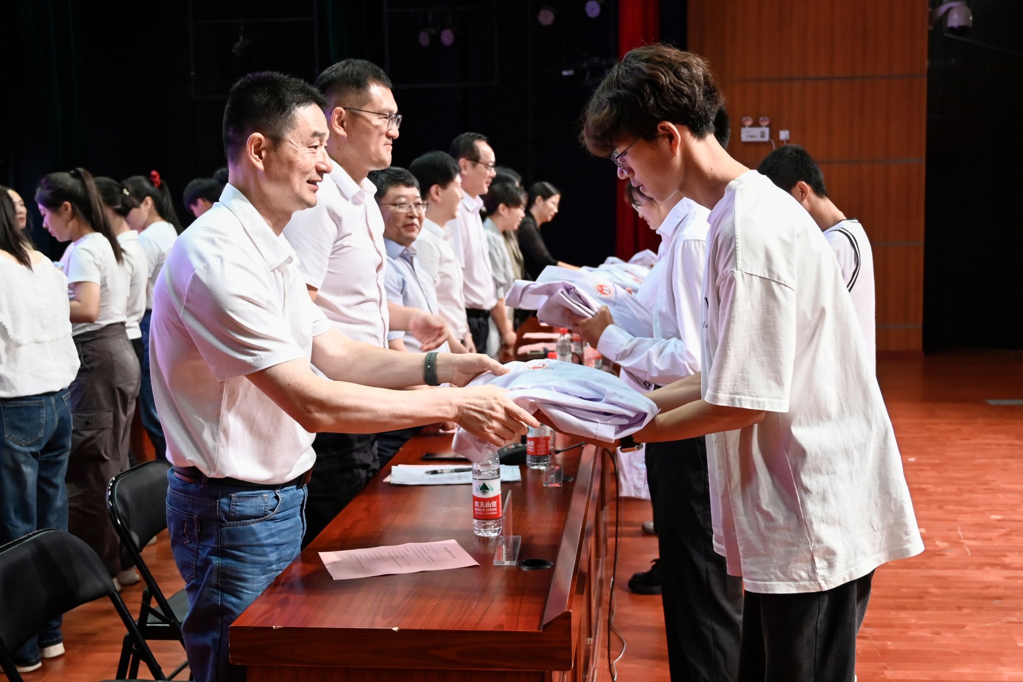 典礼上,学院还为新生举行了授袍仪式。16位新生代表依次上台,主席台就座的领导和老师们为新生授予白袍,并帮助新生整理仪表。对于新入学的医学生来说,这是一个重要的里程碑,授袍仪式标志着医学生涯的正式启航。最后,典礼在全体医学生庄严宣誓的“医学生誓言”中圆满落下帷幕。
