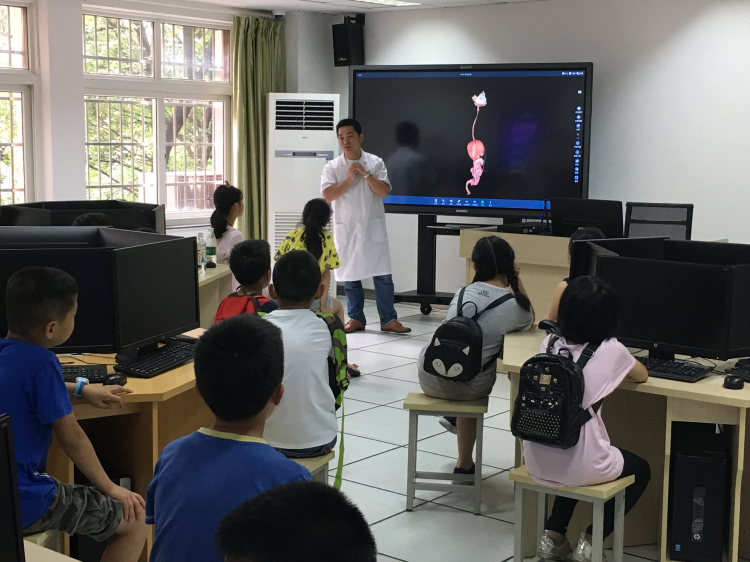 医学实验中心党支部书记黄佳对同学们的到来表示了欢迎。医学实验中心副主任陈士票陪同孩子们参观了医学虚拟仿真实验室、显微镜实验室,声情并茂地介绍了循环系统和消化系统两大系统,带领孩子们亲自动手制作洋葱表皮细胞标本,利用显微镜观察不一样的微观世界,最后参观了病理标本室,孩子们第一次见到人体器官标本,感到非常震撼。