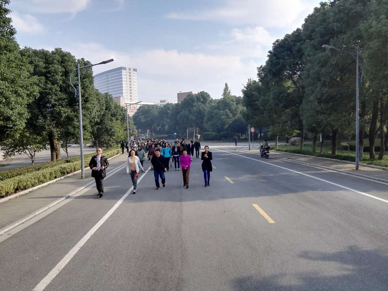 实验中心门口准备“步调一致”健步走,9:30,大家开始围绕梁林校园进行健步走,健步过程中,大家三三两两走在一起,一边健步,一边聊天,既锻炼了身体,又增进了彼此同事间的交流。
