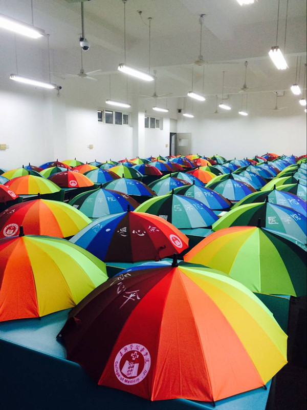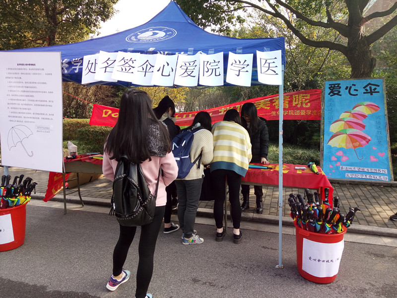 由于江浙地带的天气总是变幻莫测,且嘉兴处于江、海、湖、河交汇之处,当天的天气变幻总是让人难以预测,雨天也是尤其常见。为减少给全校师生带来的不便,我院特为全体师生提供了“爱心伞”,旨在让一把小小的伞满载爱心传递在学校的每个角落,温暖你我他。