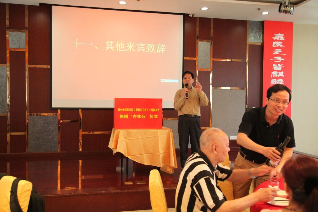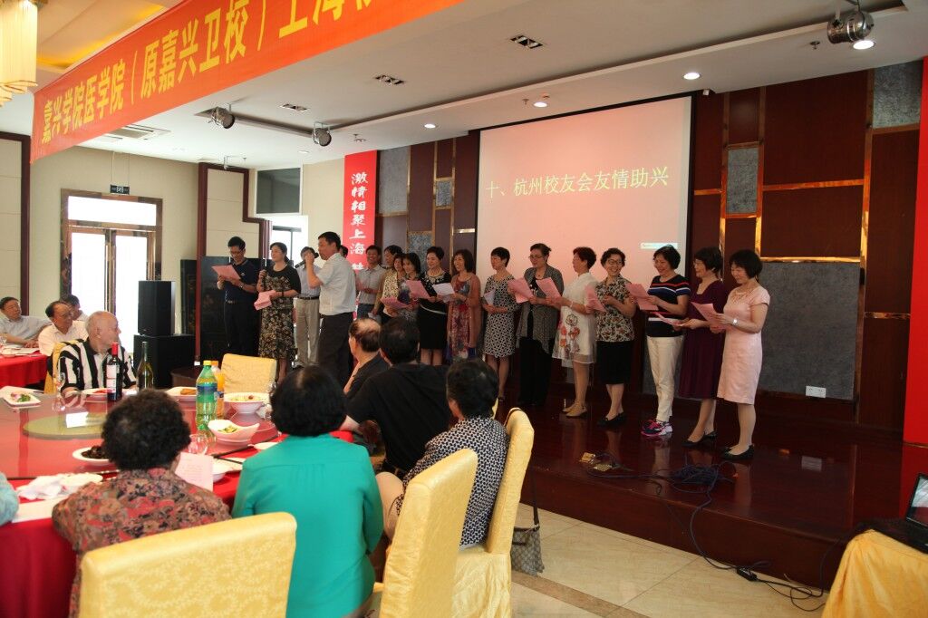 原党委贾书记向与会校友介绍了校友会筹备情况。大会通过了上海校友会章程,通过了校友会组织领导成员,李军艳校友当选会长并作了精彩绝伦的演讲。嘉兴学院党委副书记吕延勤专程赴会并作了情深意切的讲话。嘉兴学院上海校友总会副会长俞汉平、杭州校友会名誉会长孟卫民发表了热情洋溢的贺词。嘉兴卫校76届校友的红歌联唱《我的祖国》、《年轻的朋友来相会》、《弹起我心爱的土琵琶》、《洪湖水浪打浪》等独唱合唱,指挥潇洒,热情奔放,把庆典推向高潮。徐言平老师声情并茂的诗朗诵,仿佛又回到了激情难忘的年代,使众人回味无穷。