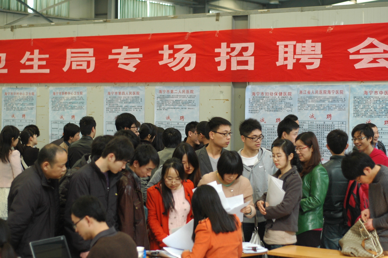 在梁林校区风雨操场成功举办了“2012年海宁卫生局专场招聘会”。共有人民医院、中医院、许村中心卫生院等14家用人单位,提供临床医学本科岗位62个,护理学本科岗位24个。参加本次招聘会人数有160余人。