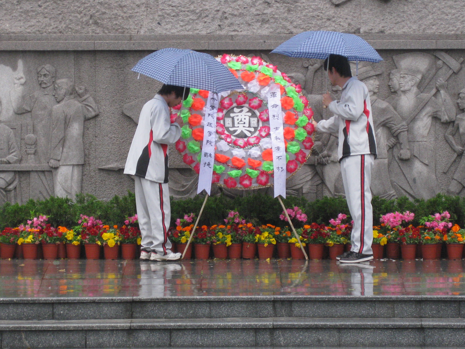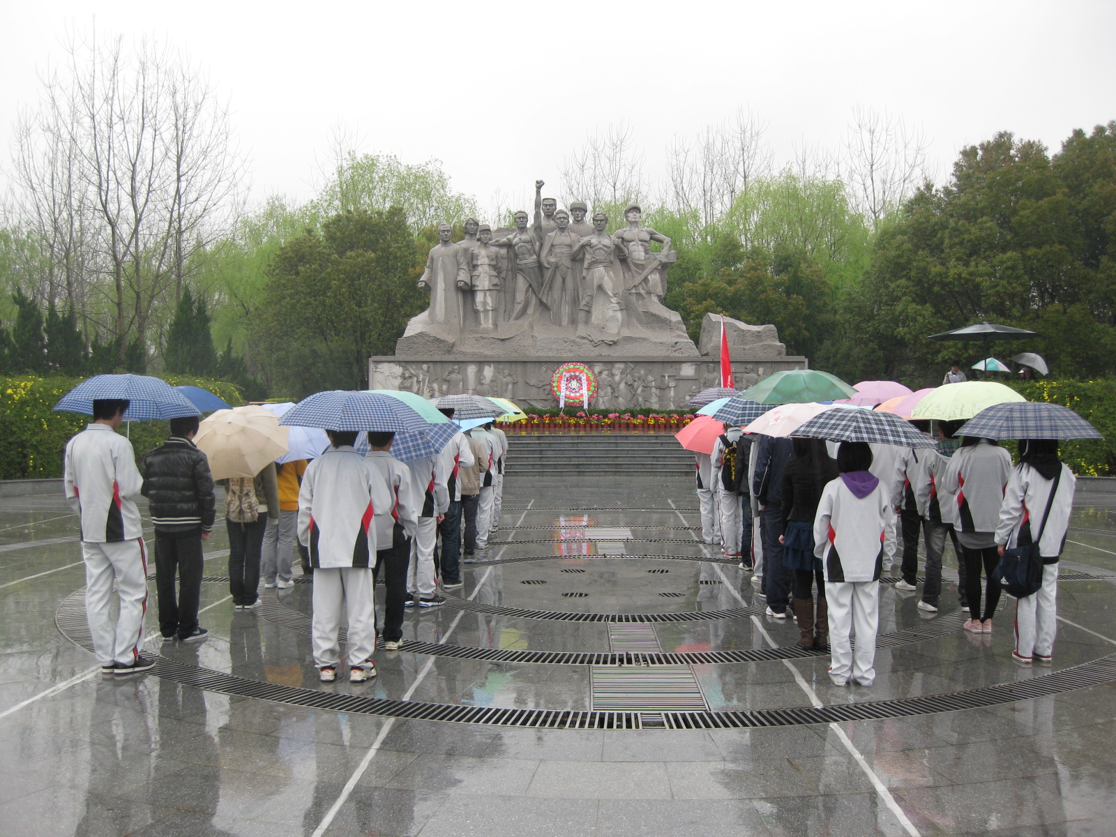 在人民英雄革命烈士的雕像碑面前,同学们肃然起敬,并分成四列站立,伴随着庄严的国歌,两名学生代表向人民英雄革命烈士敬献了花圈,接着奏哀乐,全体默哀三分钟使现场气氛变得相当凝重。