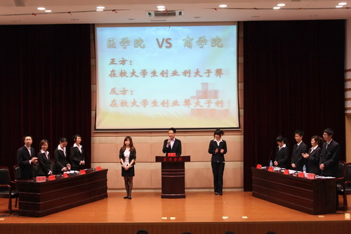 的观点是“在校大学生创业利大于弊”,反方商学院的观点则是“在校大学生创业弊大于利”。两方就这一辩题展开激烈的讨论。