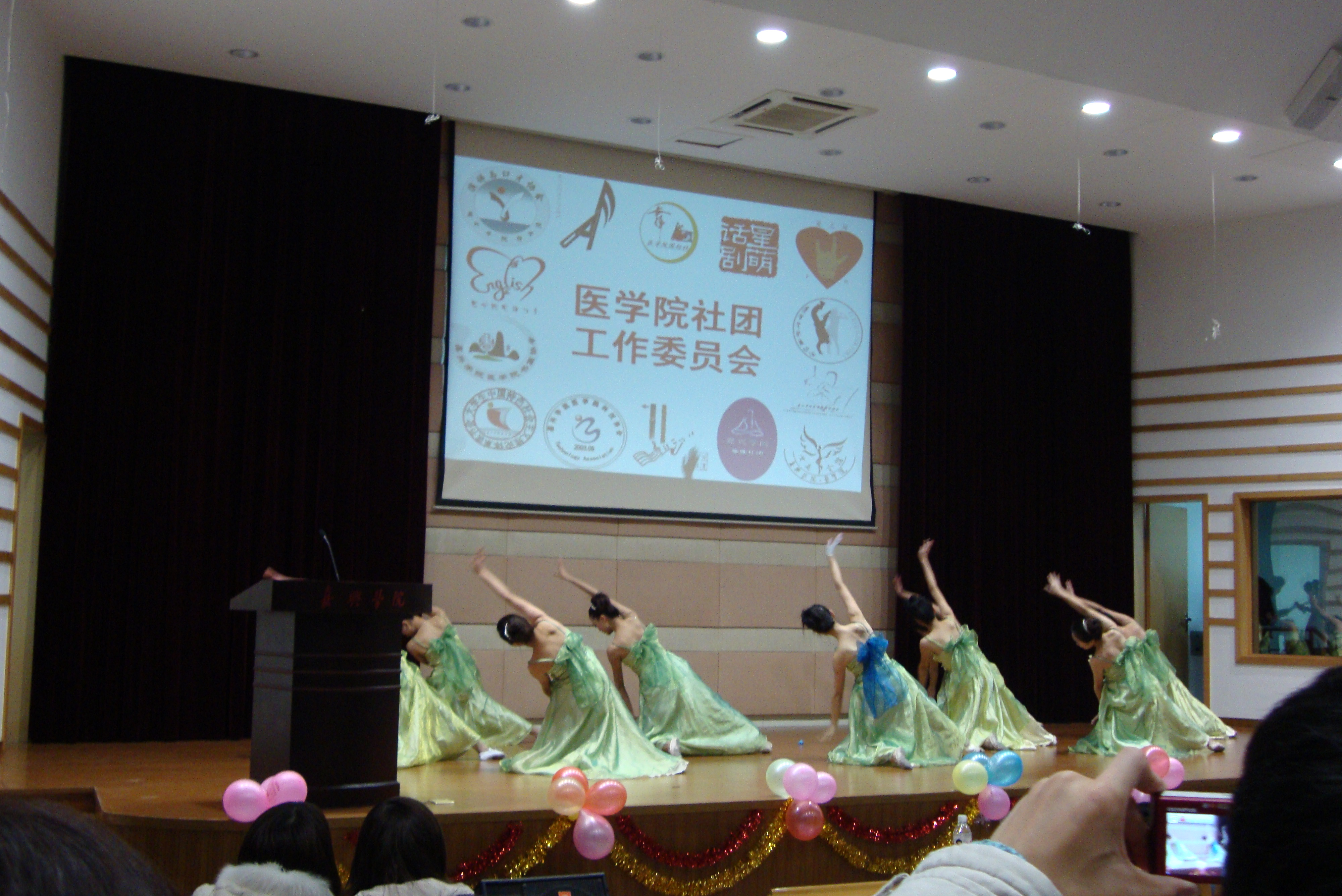 14个学生的社团的发展情况,用PPT的形式展示了各社团的风采。接着由笛箫协会带来一曲笛子吹奏《大中国》,使在场的每位听众耳目一新;吉他协会带来一曲《外面的世界》,勾起大家的怀旧情绪;手语协会的手语表演《新青年制造》,激起大家的融融暖意;女生会馆带来的印度舞《印度新娘》和街舞协会带来的街舞表演都给在场的观众带来视觉和听觉的冲击,也充分展示了我院社团的魅力与风采,更是将现场的气氛推向了高潮。