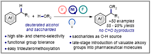 文章研究发展了一种可见光/镍共催化的苄基碳氢键烷氧基化方法。这种方法可以以中等至优异的产率合成结构多样的功能性苄基醚,具有很高的区域选择性和化学选择性。商业可得的氘代甲醇作为三氘甲氧基化源以及糖类化合物的顺利转化是本研究的亮点,这一方法为结构复杂的苄基醚类药物分子的合成提供了一种实用的新工具,进一步推动药物研发进程。