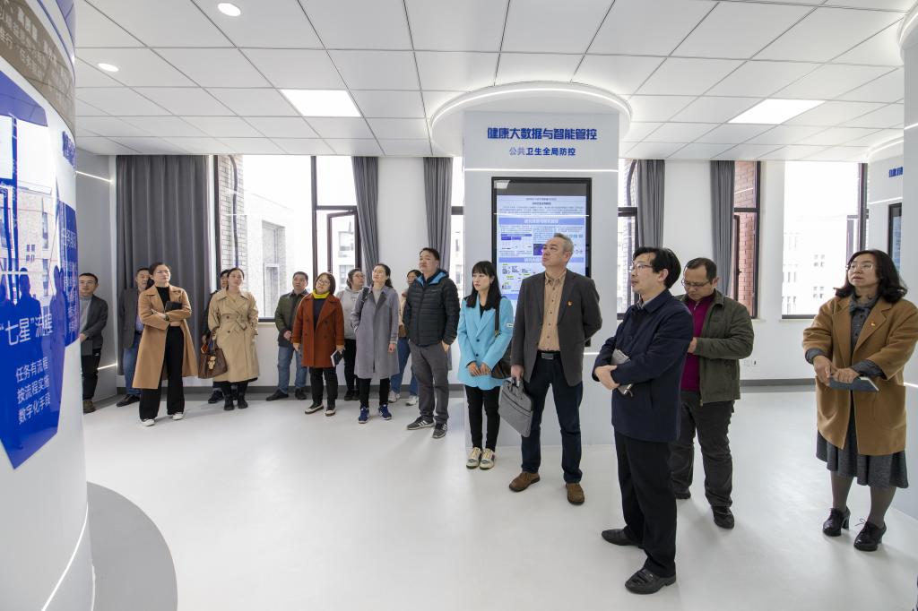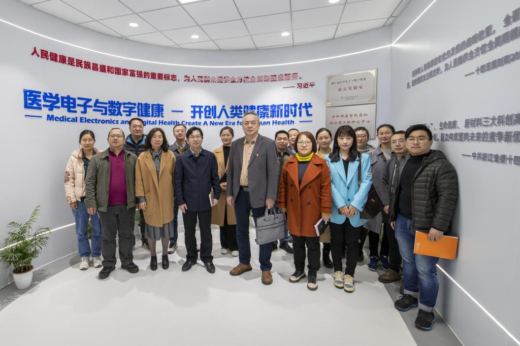 信息网络与智能研究院张先超执行院长带领大家参观了浙江省医学电子与数字健康重点实验室展厅,讲解了实验室构建医学电子与数字健康价值体系、产业体系与创新体系等三大体系的任务,以及生理/生物信息智能感知、健康信息网络与安全、健康大数据与智能管控等研究方向。参观结束后,大家关于如何开展医学与信息交叉融合科研进行了深入交流、讨论。