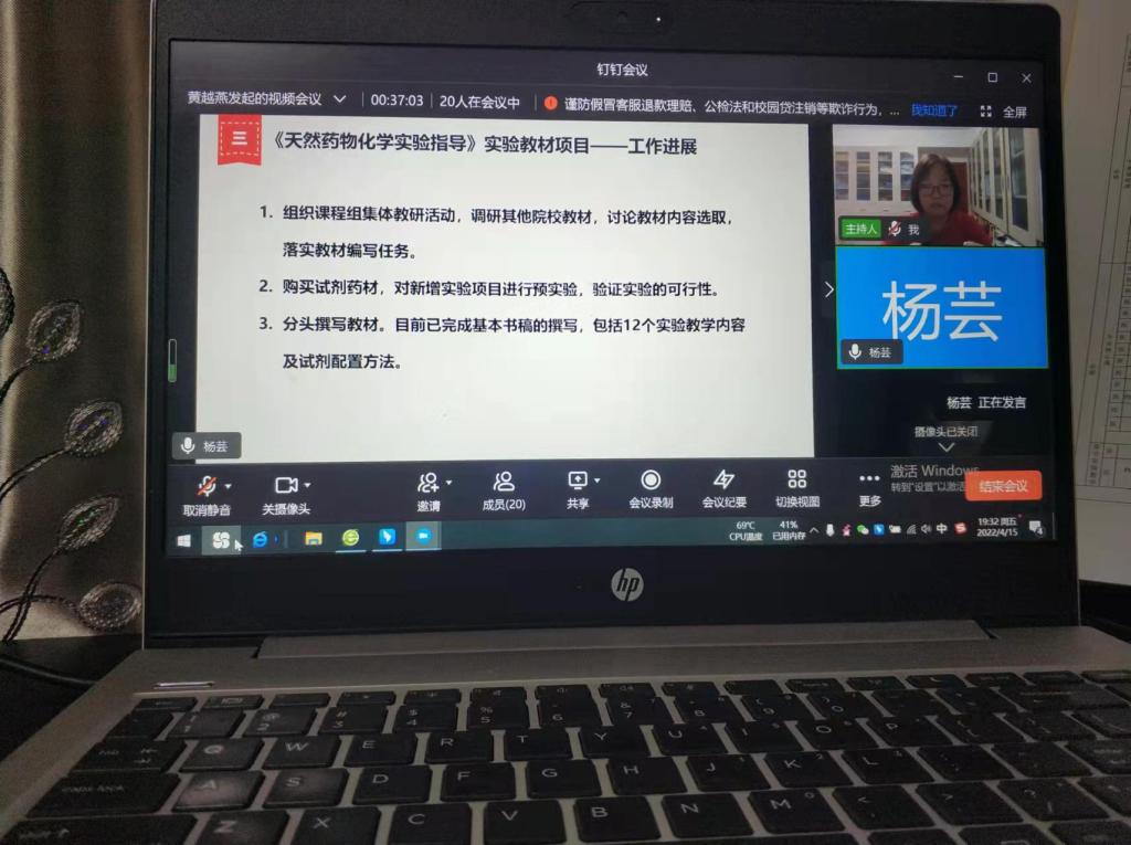 2022年4月16日晚间,药学系在钉钉平台举行了一次在线会议。这是本学期第二次集体教研活动,由全系教师参加。集体教研活动是促进教师专业发展、促进专业建设和学科建设的重要途径之一,药学系一直高度重视和扎实推进常态教研工作。在当前疫情不稳定时期,钉钉在线会议发挥了更大的优势,把隔离在家的教师、出国访学的教师等都集中到屏幕前,共同参与教研活动,为更好地促进药学专业建设与发展而集思广益,沟通协调。