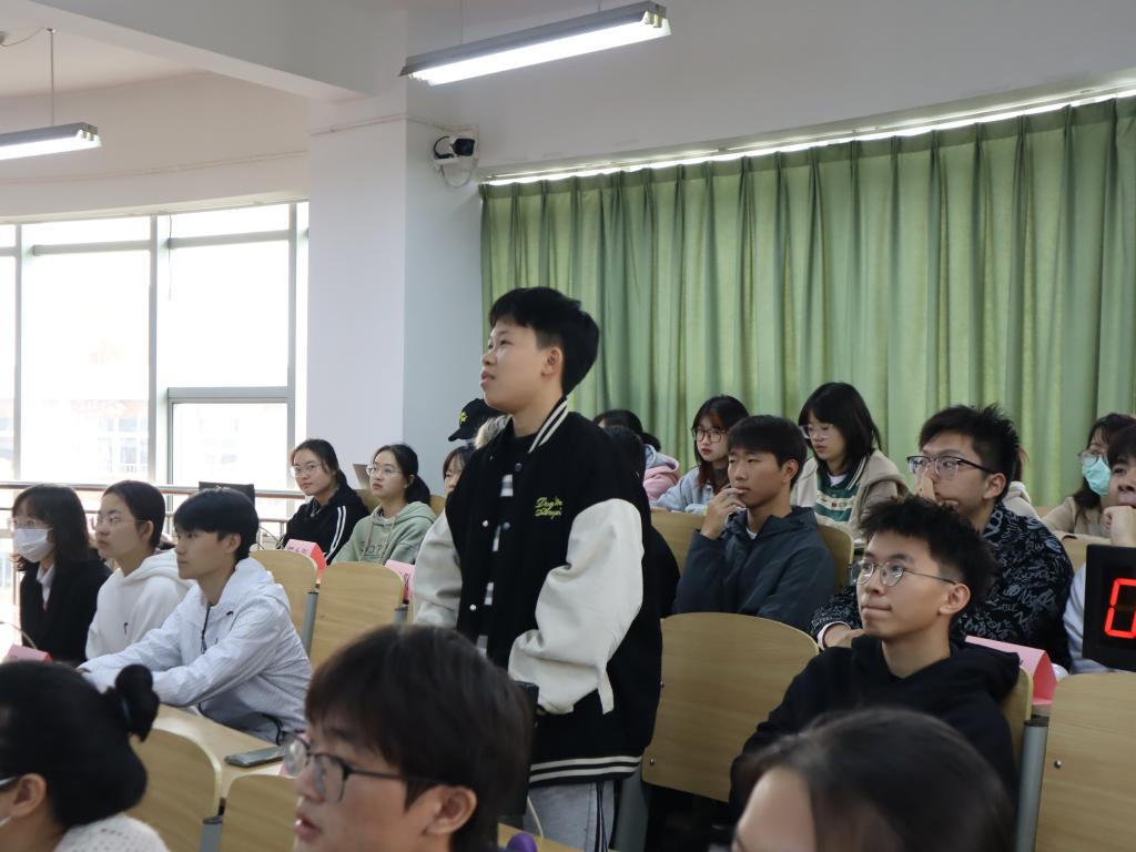 决赛以班级为小组进行答题积分。本轮比赛由个人必答题和小组抢答题两部分构成。比赛进行时,在主持人详细介绍完比赛规则后,选手们跃跃欲试,充分展现了其作为青年学生所具备的敢试、敢说、不服输的气质。现场的紧张气氛在抢答环节达到最高点。选手们明确分工,专注听题,生怕错过拍打抢答题获得答题机会的最佳时机。观众和老师们沉浸在选手们的激烈角逐中,随选手们的激情答题情绪高涨。