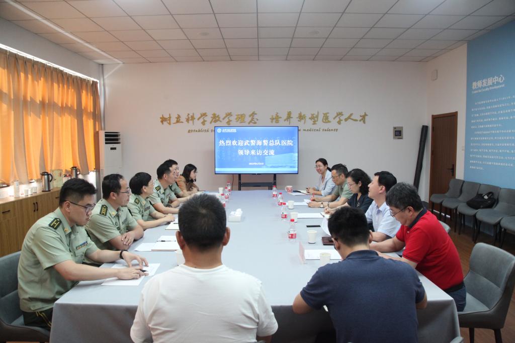 6月8日下午, 武警海警总队医院院长高丽娜、政委吴晓鹏一行来我院考察交流。校党委委员、副校长张琦出席座谈会,365bet