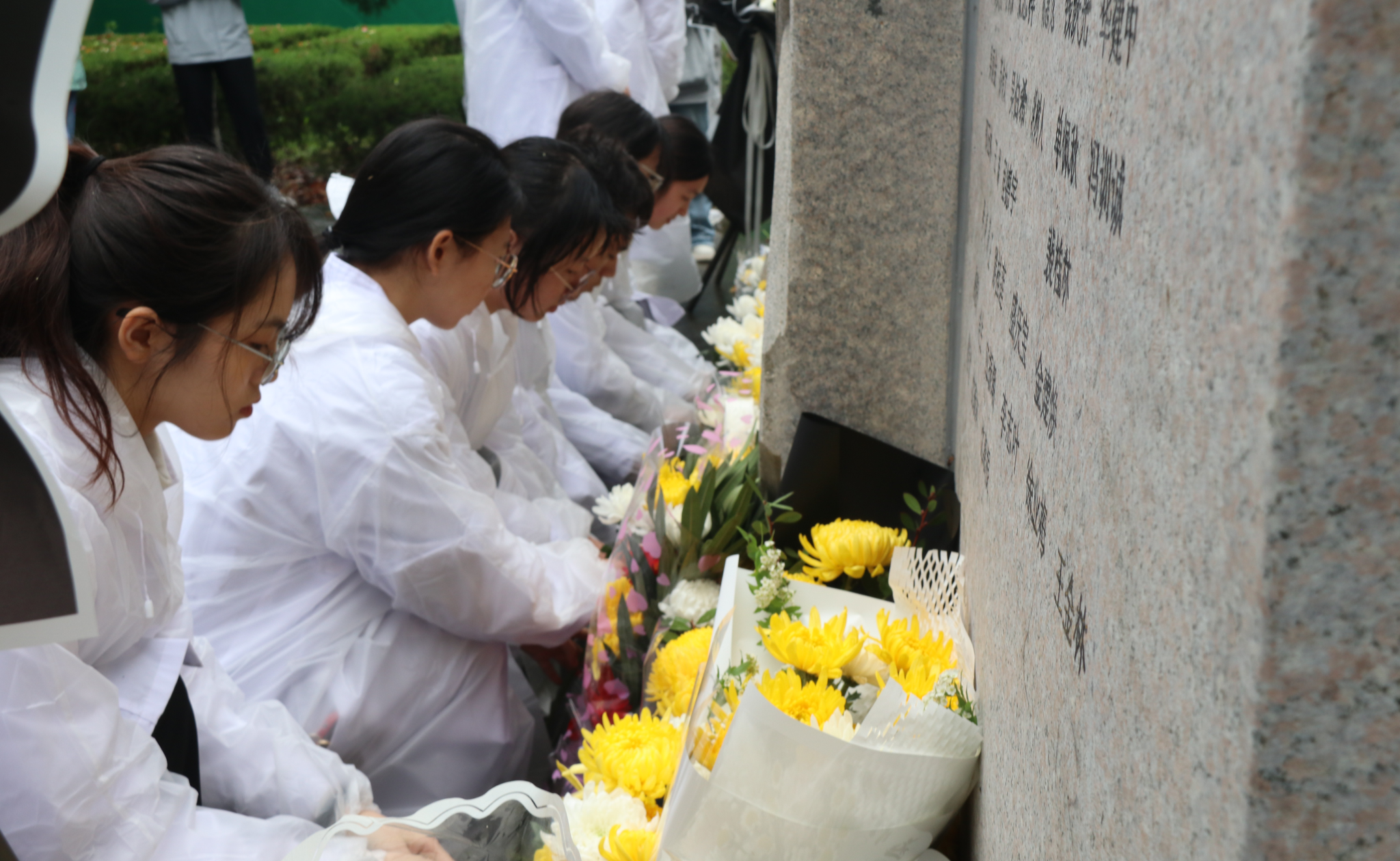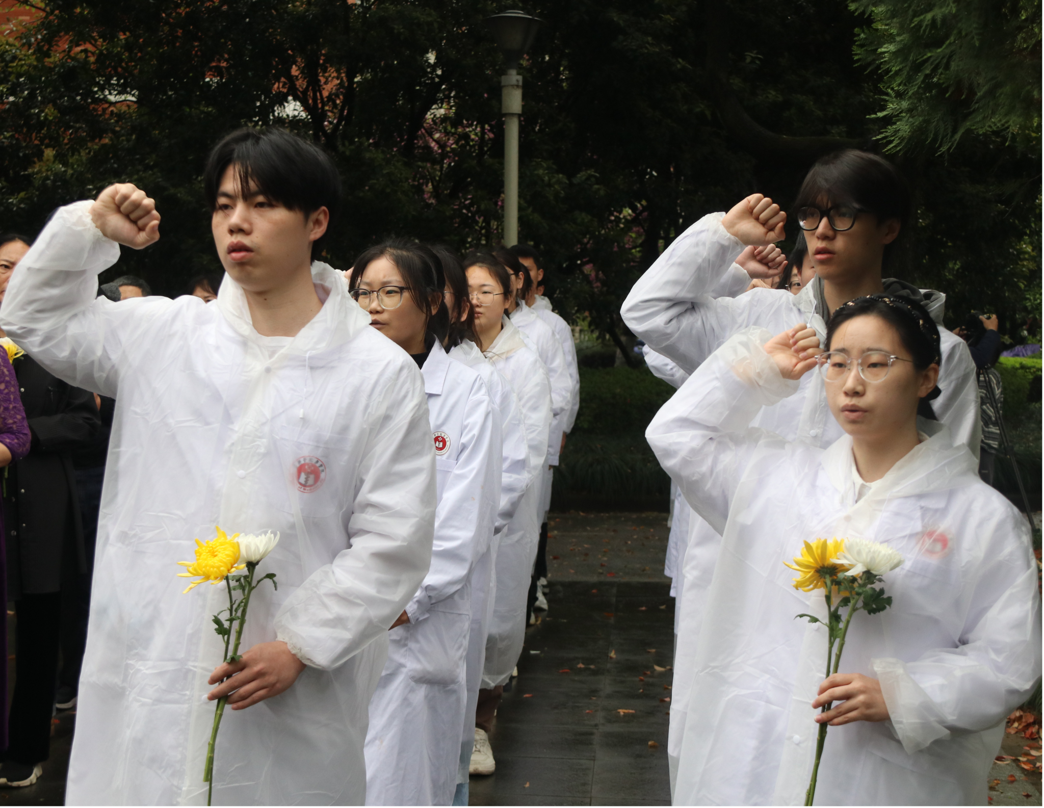 无言教导,掷地有声。截至目前,石碑上已镌刻146位遗体捐献者和167位器官(组织)捐献者的姓名。大体老师用自己的身躯做教材,传授医学生们宝贵的人体知识。“健康所系、性命相托。当我步入神圣医学学府的时刻,谨庄严宣誓:我志愿献身医学,热爱祖国,忠于人民,恪守医德,尊师守纪……”学生代表们紧握右拳,目光坚定,声音嘹亮,用铿锵誓言表达“除人类之病痛,助健康之完美”的初心和使命,刻苦钻研、勤于实践,决不辜负大体老师的殷殷期盼和无私奉献。
