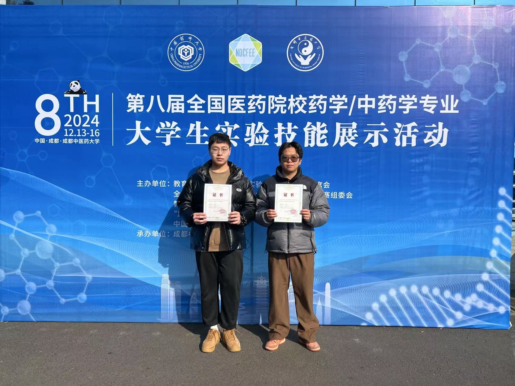 12月14-15日,第八届全国医药院校药学/中药学专业大学生实验技能展示活动在成都中医药大学成功举办。我院药学专业22级何博洋、李书铭两名同学分别荣获本次大赛的一等奖、二等奖。创历年我校学生参与此项赛事的最好成绩。